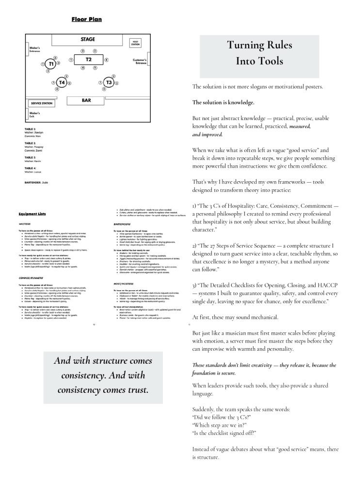 สำหรับบางคน มาตรฐานที่สูงอาจหมายถึงความรวดเร็วสำหรับอีกคนหนึ่ง อาจหมายถึงความเป็นมิตรหรือสำหรับใครบางคน อาจหมายถึงการจดจำปีของไวน์ได้อย่างแม่นยำหากไม่มีระบบที่ชัดเจนและสามารถวัดผลได้ คำว่ามาตรฐานก็เป็นเพียงคำขวัญเท่านั้น และคำขวัญไม่สามารถให้บริการแขกได้การกระทำต่างหากที่ทำได้