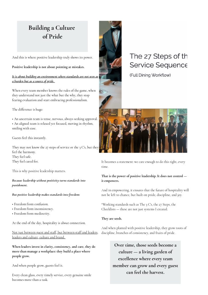 มาตรฐานการทำงานอย่าง 3 C’s, 27 Steps, และ Checklists ไม่ใช่แค่ระบบที่ผมสร้างขึ้นมา แต่คือ เมล็ดพันธุ์ที่เมื่อปลูกด้วยภาวะผู้นำเชิงบวก จะเติบโตเป็นวัฒนธรรมและสวนแห่งความเป็นเลิศที่ทุกคนในทีมเติบโตได้ และทุกแขกรู้สึกถึงผลลัพธ์